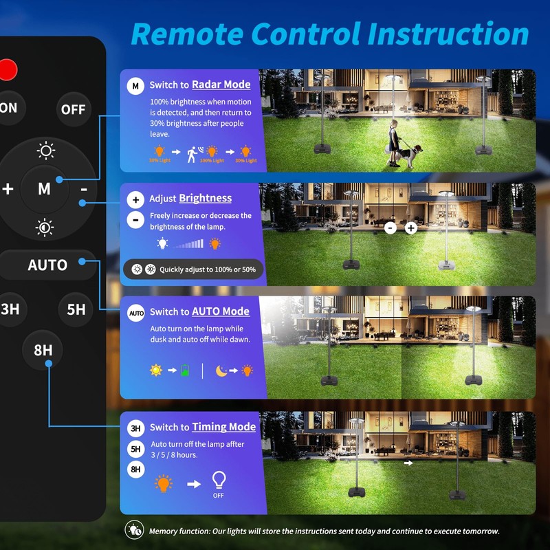 Timed Mode (Remote): Set for 3H/5H/8H operation after dusk.