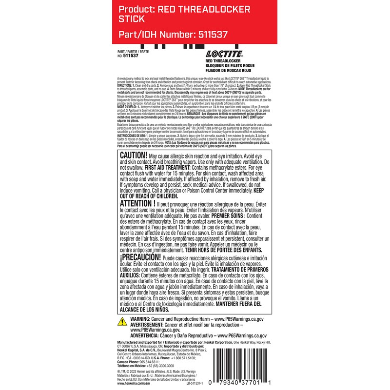 LOCTITE Threadlocker Glue Stick Red 268 is a high-strength, high-temp, wax-based adhesive designed for heavy-duty applications where maximum holding power is needed. Trusted by professionals and OEM-specified, this anaerobic threadlocker bonds securely to all metals, including stainless steel, aluminum, and plated surfaces. Its enhanced oil tolerance ensures reliable performance, even under extreme conditions. LOCTITE Red 268 is ideal for securing components subjected to heavy shock, vibration, and chemical exposure. It works perfectly on threads for 6mm to 19mm (1/4 in. to 3/4 in.) nuts and bolts, making it suitable for applications such as valve cover bolts, water pump bolts, oil pan bolts, drive shaft bolts, rocker studs, carburetor studs, caliper brackets, cylinder heads, and more. This threadlocker sets in just 10 minutes and achieves full strength in 24 hours, providing a durable, temperature-resistant bond up to 140°F. Whether you're working on automotive repairs or heavy machinery, LOCTITE Red 268 offers the high-strength, reliable results you need.