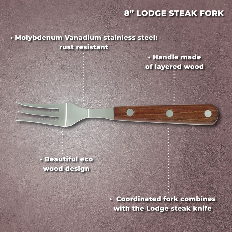Lodge Steak Knife & Fork Set – Serrated Blade – Molybdenum Vanadium Stainless Steel - Layered Oak Wood Handle - Excellent choice for informal or formal BBQs - Set includes 1 Knife & 1 Fork