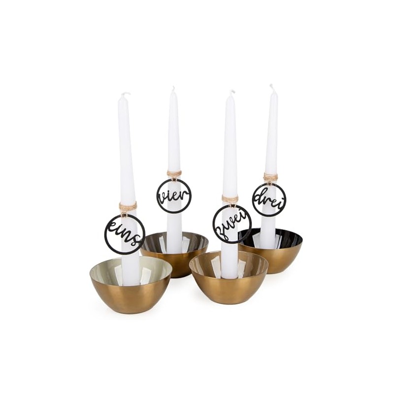 - The metal bowl candle holders are 10 m in diameter and 4 cm high - gold outside and inside in four different natural colours. The wooden numbers are thin and made of wood and have a diameter of 5 cm.