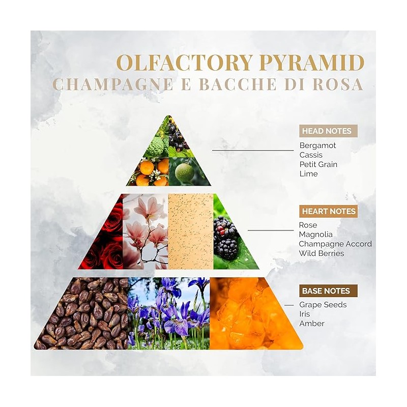 - FLORAL & FRUITY NOTES: Scent that features head notes of bergamot, cassis, petit grain, & lime, blending into heart notes of rose, magnolia, champagne accord, & wild berries, and ending with base notes of grape seeds, iris, & amber.