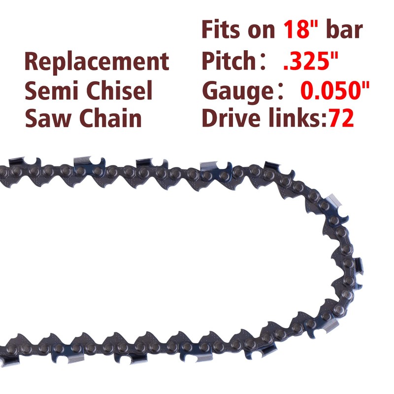 - PARAMETERS: This chain saw chain include 3 saw chains, 18 Inch bars. Pitch: .325 Pitch, Gauge: 050" Drive link count: 72.(The same saw can be equipped with different bar lengths. Please verify your parameters to ensure this chain works with your machine. )