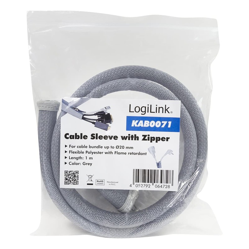 LogiLink KAB0071 Cable Sleeve with Zip for Protection of Cables and for a Tidy Look, Diameter 20 mm, 1 m, Grey
