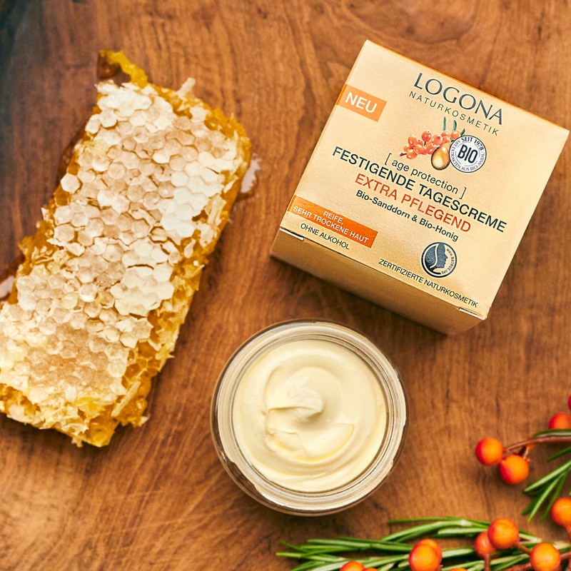 LOGONA's age protection product line offers an effective active ingredient combination made up of valuable organic sea buckthorn berry extract, hyaluronic acid, organic organ oil as well as organic broccoli seed oil that pampers mature skin for a more beautiful appearance. These cosmetic products protect the skin against stress factors and premature aging, provide intensive moisture, minimises the appearance of wrinkles and sustainably revives the skin.