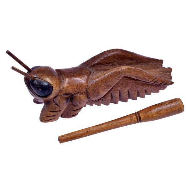 Hold the cicada by the head and stroke the thin side of the stick from the head over the prongs on the stomach of the cicada. It sounds a deceptively real chirp. Try out how the tone changes and becomes even more natural when you stroke the prongs 2 times in a row.