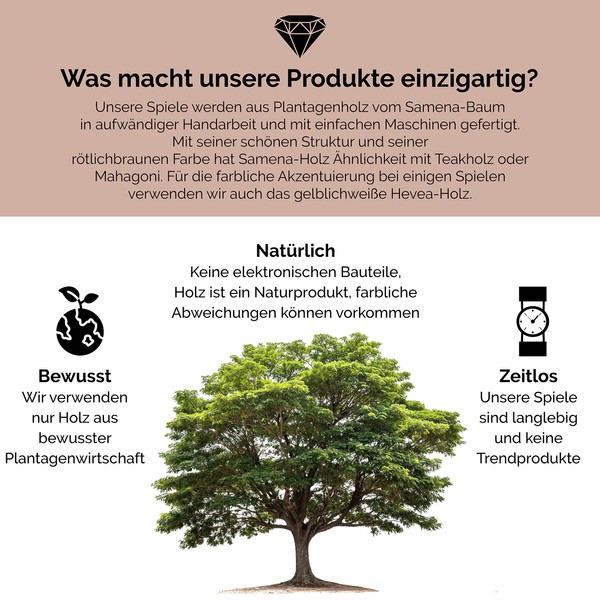 This game is made from environmentally friendly plantation wood from the Samena tree (Lat. Pithecellobium Saman) elaborately handmade and made with simple machines. With its beautiful texture and reddish brown color, Samena wood is similar to teak or mahogany. A treatment with teak oil gives the wood a honey-coloured, warm tone as well as a matte silk shine that does not wear out even after long use.