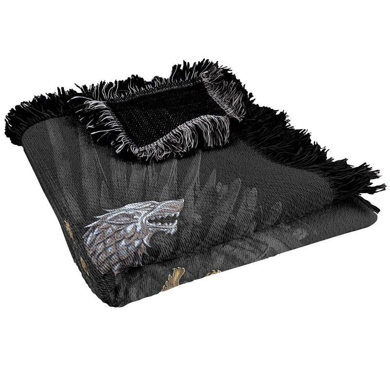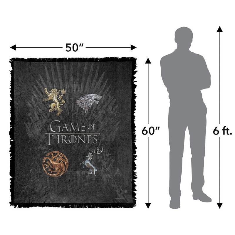 - GAME OF THRONES CHROME HOUSE SIGILS WOVEN THROW BLANKET 50" x 60": Our woven throw blanket with fringed trim features a fabric weight of 530gsm and offers endless warmth and comfort. The ideal gift for the fan in your life, our cozy all-season blanket is generously sized, making it perfect for beds and couches, wall decor, or use while travelling.