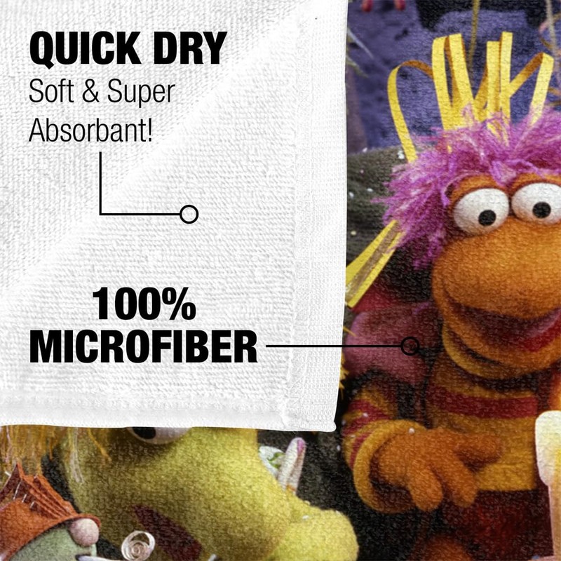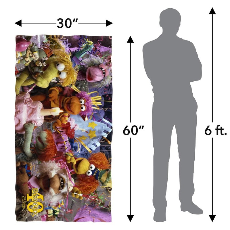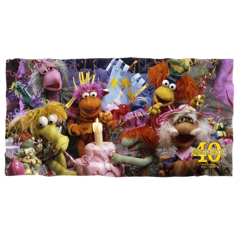 - JIM HENSON - FRAGGLE ROCK FRAGGLE 40TH BIRTHDAY PARTY 30" x 60" BEACH TOWEL - This lightweight and compact beach towel is soft and comfortable, breathable, and durable. It is super absorbent to dry you quickly. The front features microfiber polyester for maximum color vibrancy and the back features cotton for maximum absorbency.