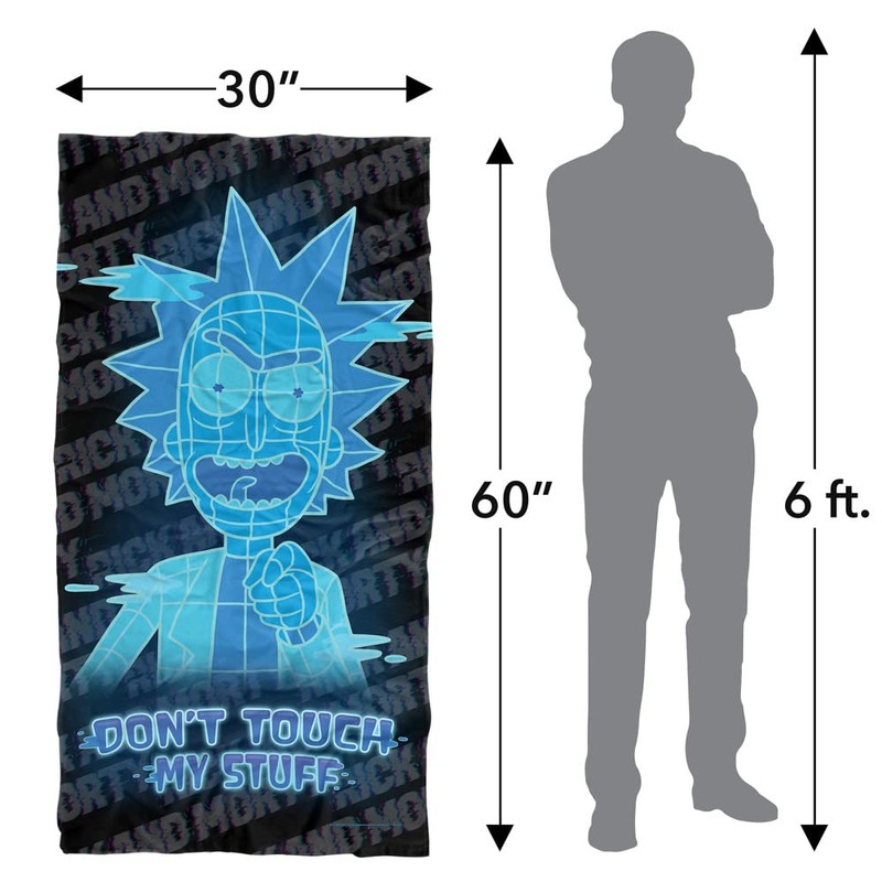 - RICK AND MORTY DON'T TOUCH MY STUFF 30" x 60" BEACH TOWEL - This lightweight and compact beach towel is soft and comfortable, breathable, and durable. It is super absorbent to dry you quickly. The front features microfiber polyester for maximum color vibrancy and the back features cotton for maximum absorbency.