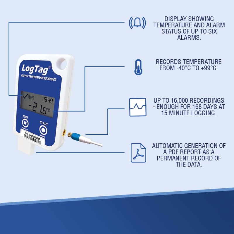 • Multi-trip logger with integral USB connector and display, for recording 16,000 real-time temperature logs from an external temperature probe.