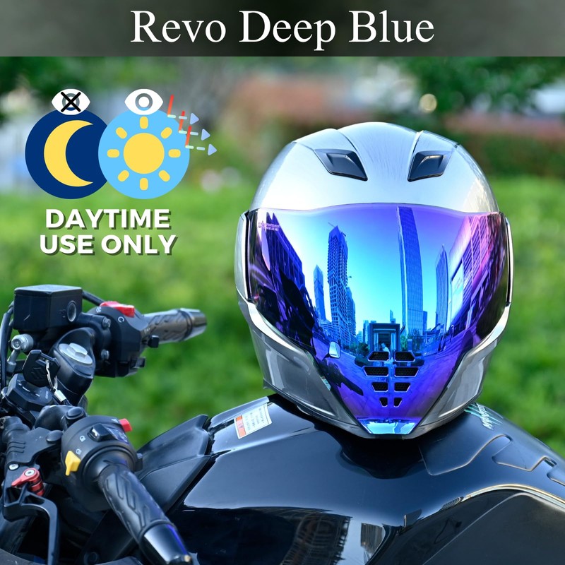 - MULTIPLE COLORS: Choose your visor tint. Available day and night use: Transparent Revo Blue, Transparent Revo Red; Only daytime use: Bronze Gold, Revo Deep Blue, Revo Deep Gold, Revo Deep Gold Red, Revo Deep Green, Revo Deep Purple, Silver, Smoke