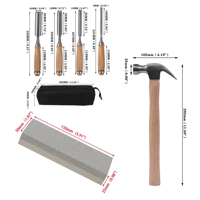 Each chisel has a black plastic edge avoidion device to avoid other items in the toolbox from scratches or scratches< Br> 2. The chisel handle is made of beech wood and tightened with a stainless steel hoop, providing you with the most comfortable and secure grip< Br> 3. The woodworking chisel is made of chromium vanadium steel material, which has high hardness and durability< Br> 4. The chisel set is particularly suitable for trimming wood and edges, making it suitable for amateur and professional carpenters or woodworking artists to work< Br> 5. Suitable for root carving, wood carving, flower carving, rough carving, board painting, etc< Br> Products include: