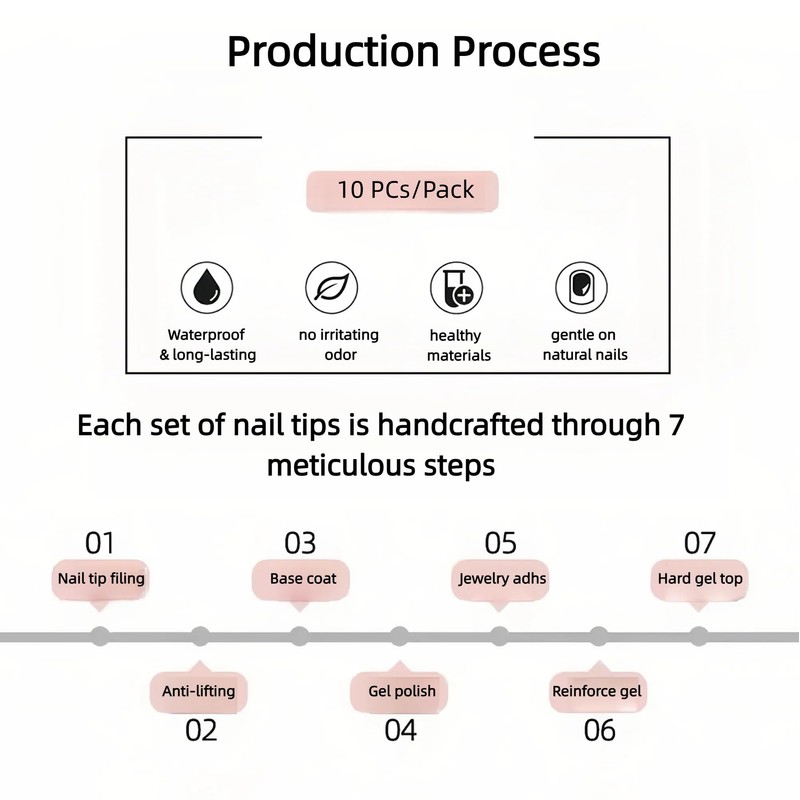 Bored of the same nails? We offer a diverse collection of wearable nails, including Short Duck-Bill, Dragon Claw, Short Square, Stiletto, Almond, and more. Whether you prefer minimalist lines, cute cartoons, or elegant metallics, there’s a style for every mood and event.