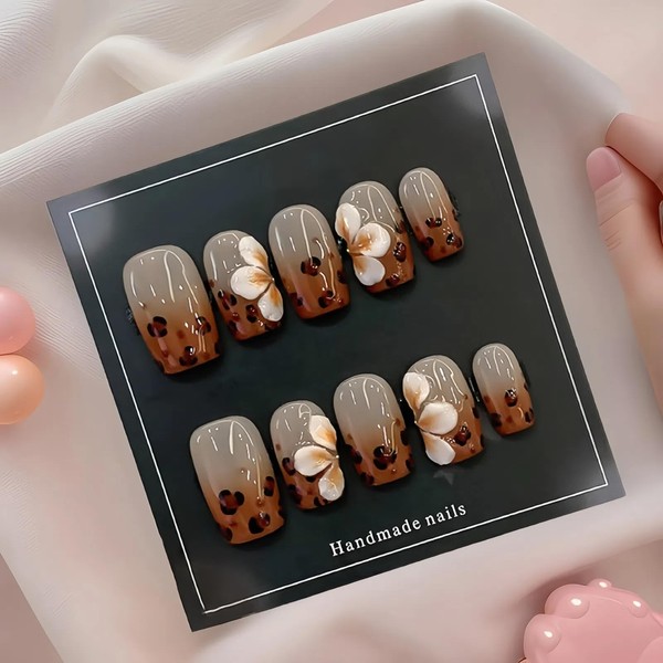 LOHAS Home 3D Carved & Painted Handcrafted Premium Wearable Nails Reusable French Short Square Press-on Nails, Leopard Print & Flower