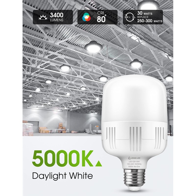- HIGH SAFTY & LONG LIFESPAN : Lohas warehouse led bulbs extends service life to 50000 hours with insulated heat conducted housing.We don't need to replace the ceilling bulbs as often as before, which will save both cost and time !
