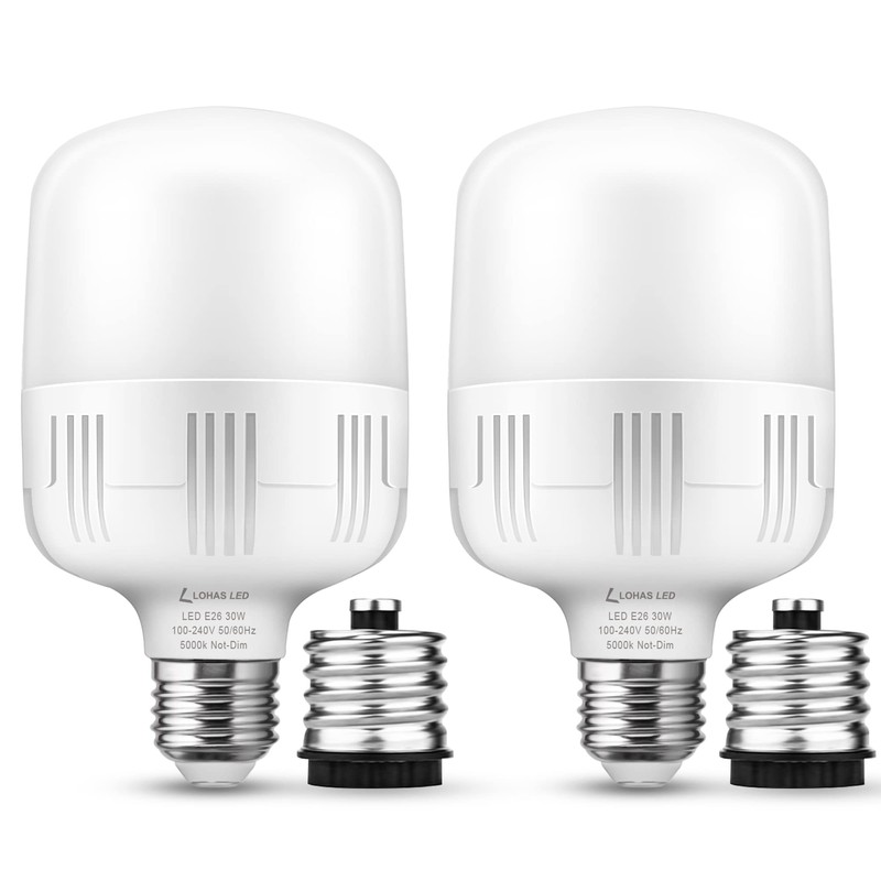 LOHAS Super Bright Light Bulbs, 250-300W Equivalent 3400LM E26 Garage LED Bulb, 5000K Daylight 30 Watt High Lumen LED Bulb w/E39 Adapter for Commercial Warehouse Workshop Factory Backyard Barn, 2 Pack
