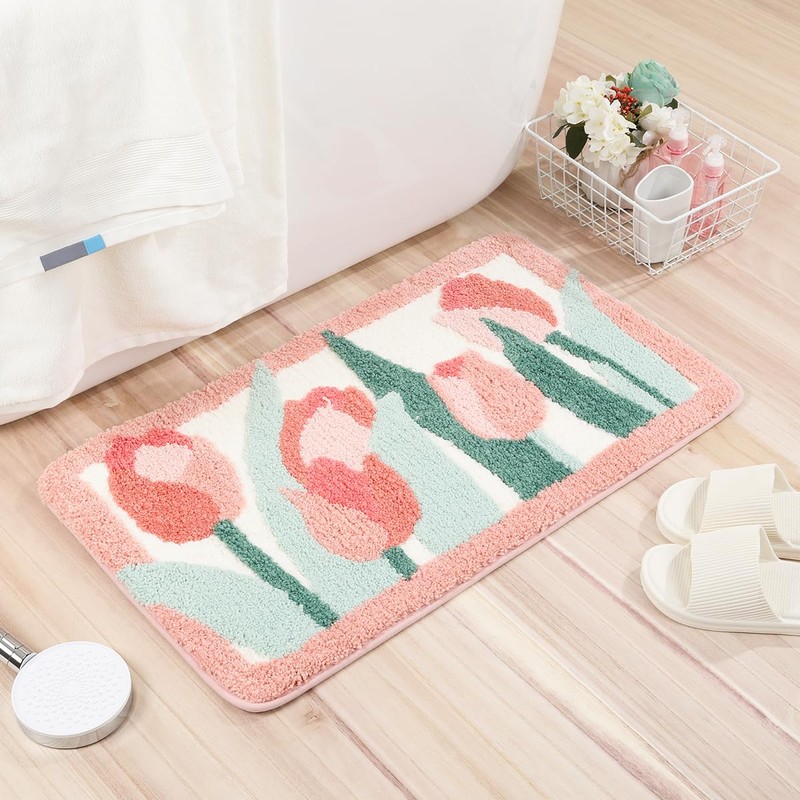 Loismood Floral Bath Mat Cute Quick Drying Carpet Machine Wash and Non Slip Bath Rug for Sink, Bedroom and Shower (30"x17", Tulip)