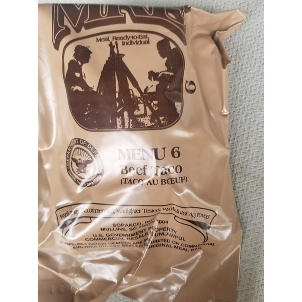 - Single meal 2022 Beef Taco Military issue MRE perfect for Hiking, Camping, and Emergencies Each package is factory sealed with Meal, Side dish, Dessert/Snack, Crackers or Bread or Peanut Butter, Powered Beverage, Utensils, Gum, Napkin, Towelette and Seasonings like Salt, Pepper and Sugar. Designed for maximum endurance and nutrition with average 1250 calories per meal. Ready to eat meal, and tested.10+ year shelf life. Great for hunting, long term survival, camping or food storage.
