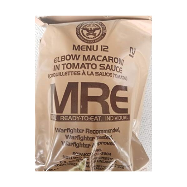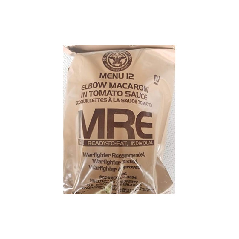- Single meal 2022 Elbow Macaroni Military issue MRE perfect for Hiking, Camping, and Emergencies Each package is factory sealed with Meal, Side dish, Dessert/Snack, Crackers or Bread or Peanut Butter, Powered Beverage, Utensils, Gum, Napkin, Towelette and Seasonings like Salt, Pepper and Sugar. Designed for maximum endurance and nutrition with average 1250 calories per meal. Ready to eat meal, and tested.10+ year shelf life. Great for hunting, long term survival, camping or food storage