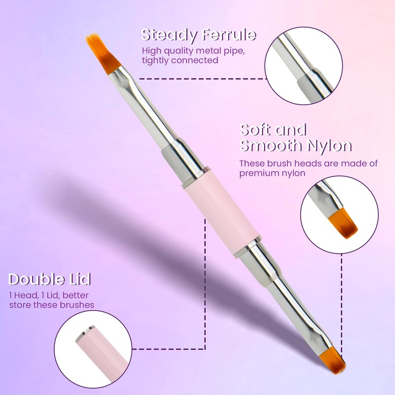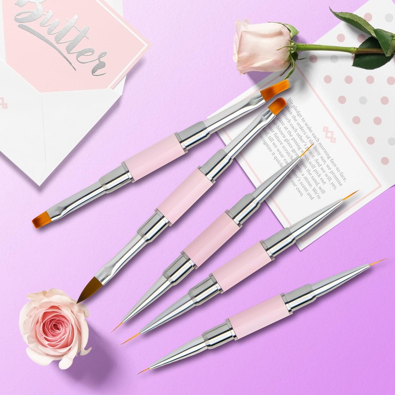 - 5 x double end brushes: 1 brush, 2 heads. You will get 10 different brush heads: 1 ombre head; 1 flat head; 1 round head; 1 acrylic head; 6 line heads (7/8/9/10/11/13mm). Double head means double brush. Compared to normal brushes, it is more practical and cost-effective. Enough to fill in colour, mix effects, write/draw or paint beautiful patterns and create great nail art designs.