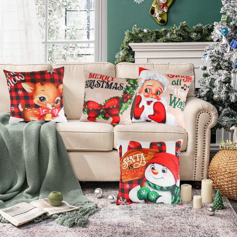 - Christmas Design: Classic Christmas Santa Claus, deer, snowman, wreath patterns are printed on these Xmas pillow covers will create a happy and merry Christmas holiday atmosphere for your living room, bedroom, office, etc.