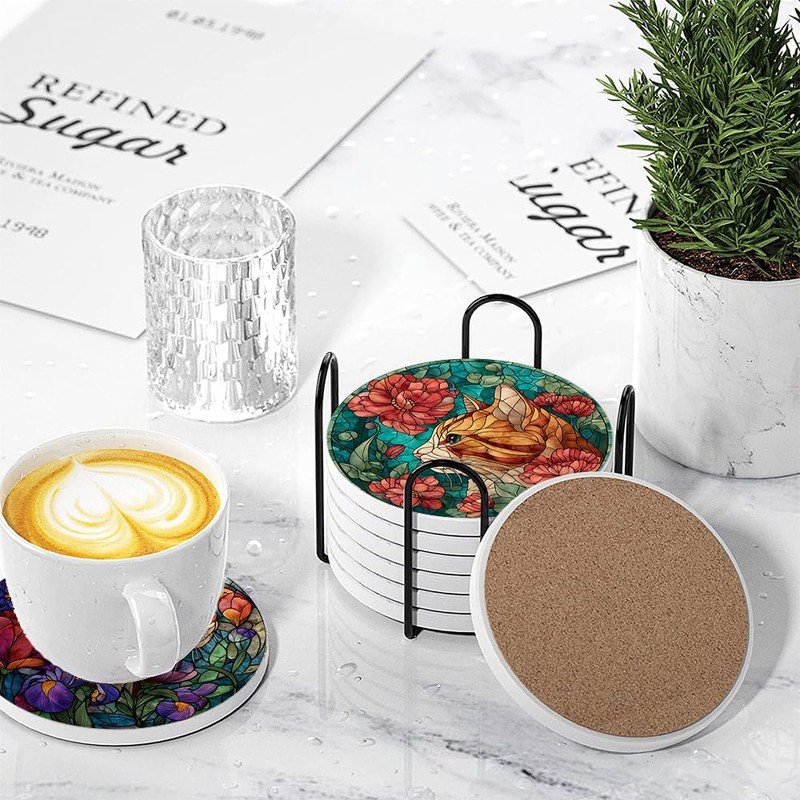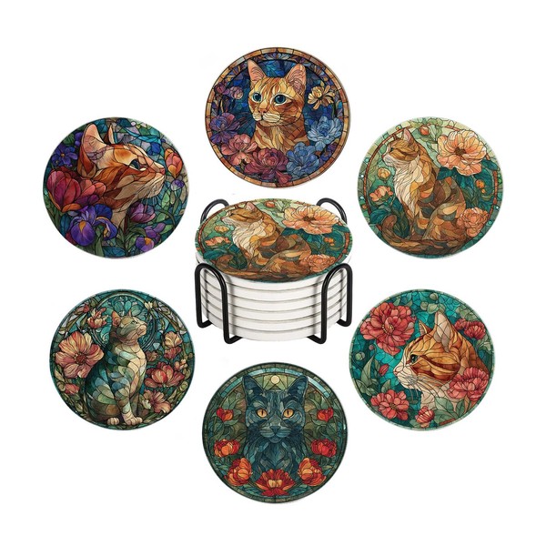 LOKMU Coasters for Drinks,Round Absorbent Ceramic Stone Coaster Sets of 6 with Metal Holder Stand,Stained Glass Cat and Flowers Coasters with Cork Base for Coffee Wooden Table,Housewarming Gifts