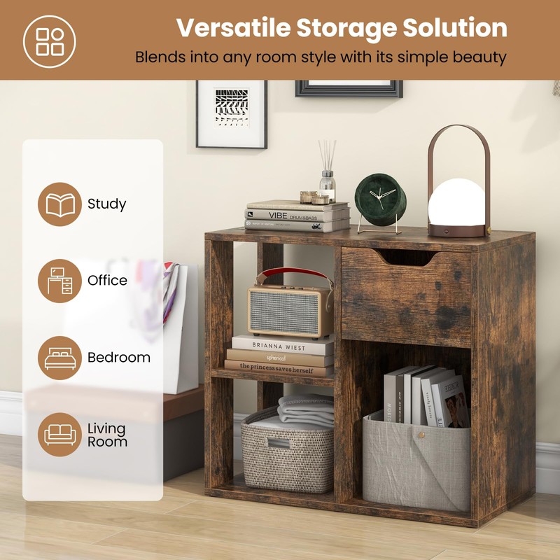 LOKO 3-Cube Bookshelf with Drawer, 2-Tier Open Shelf Bookcase, Freestanding Display Shelf, Modern Home Storage Organizer, Shelving Unit for Living Room, Bedroom, Study, Office (1, Rustic Brown)