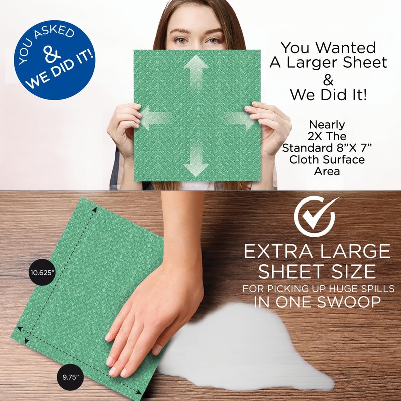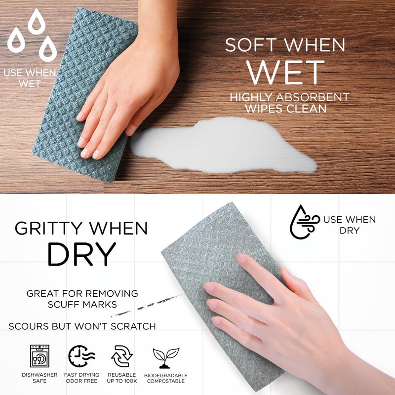 - ➤ Super Absorbent & Larger – our sheets at 11" x 10", larger than standard 8" x 7" Swedish dish cloths & absorb very quickly. Great for spills, windows, dishes, mugs, silverware, marble, wood, stainless steel & sinks - safe on any surface, never leave streaks. They lightly scrub w/ the grooved or diamond patterns. Try wowables once & you will understand why our plastic free vegan certified biodegradable compostable design makes our swedish cloths the smarter decision.