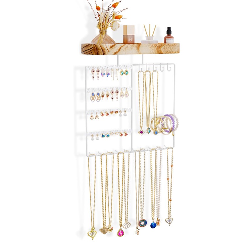 - Mass Storage: 6 Tier wall mounted jewelry racks including 144 earring holders and grooves, 25 necklaces hooks and 1 bracelets holder, better use of wall space and say goodbye to the tangled mess