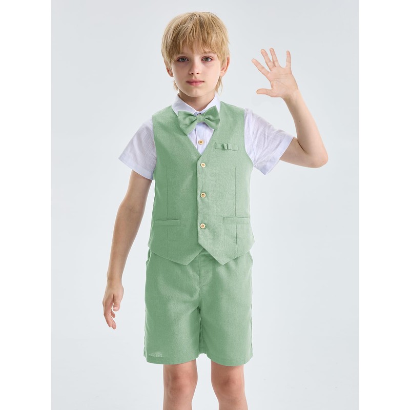 LOLANTA Boys Linen Suit 4 Piece Summer Gentleman Outfit Kids Dress Vest Shirt Shorts Set for Wedding Graduation(Green,10-11)