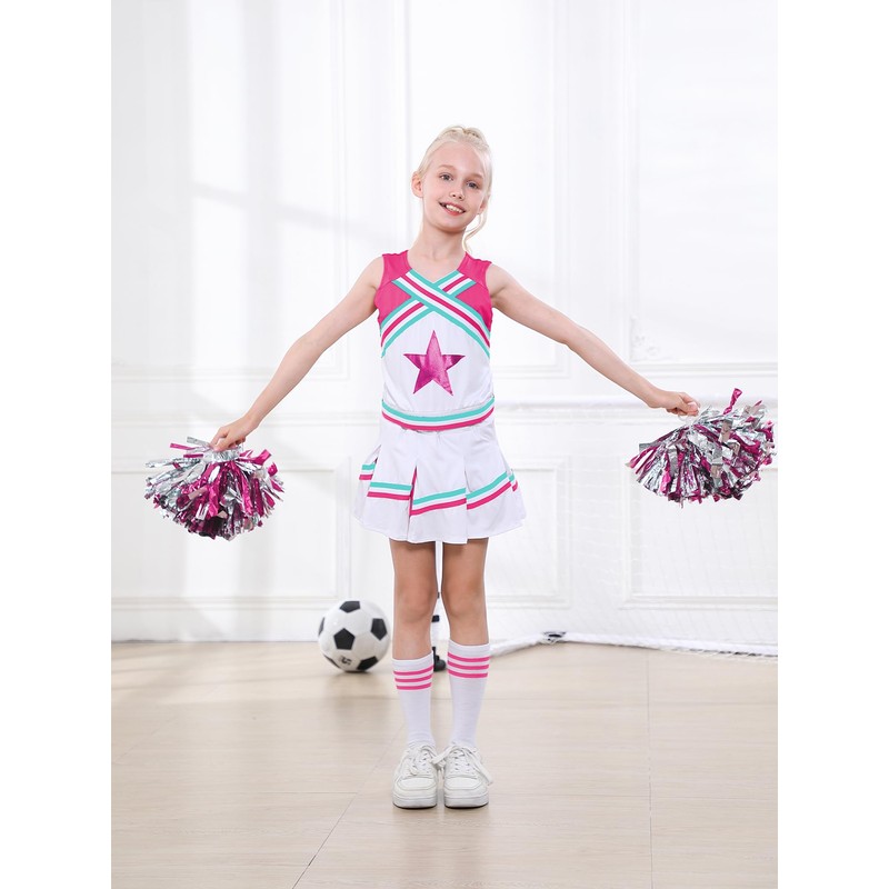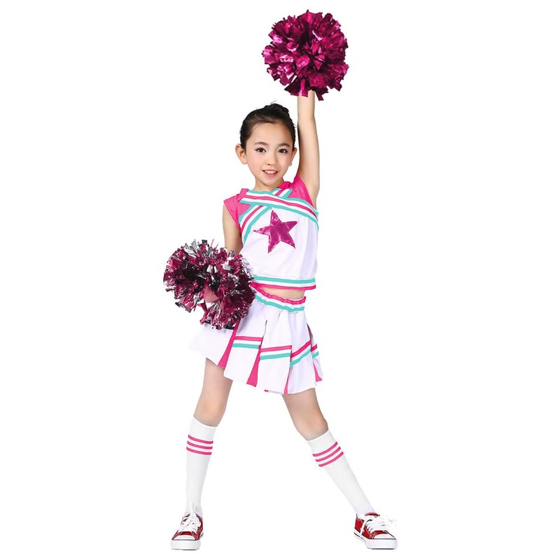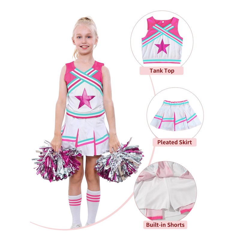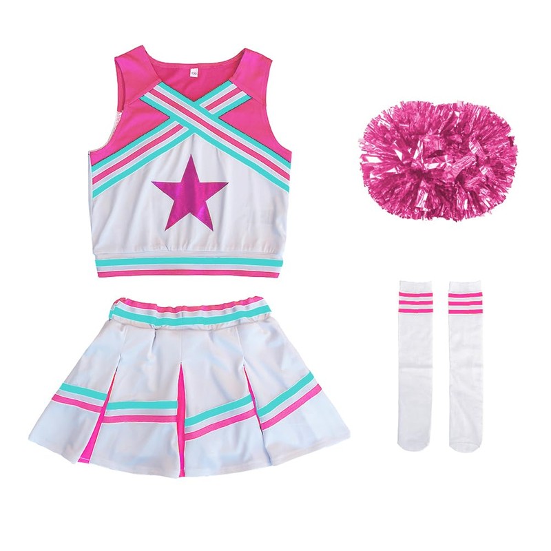 - Contents: 1 x Children's Cheerleader Costume, 1 x Pom Poms ,1 x Socks Complete the look.