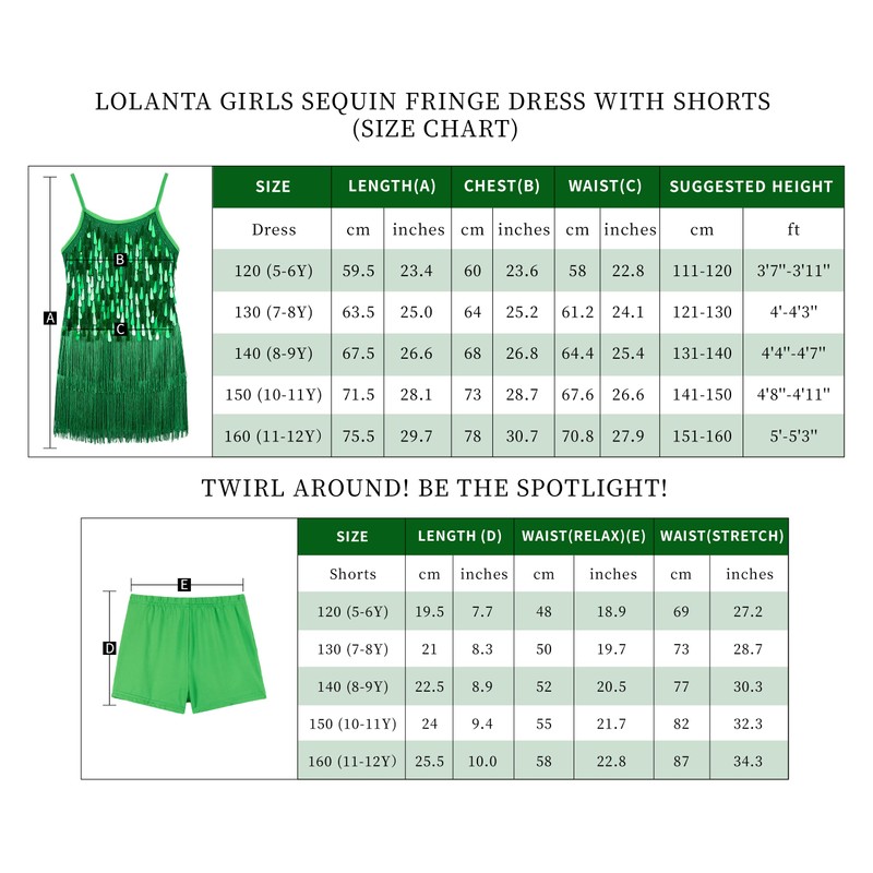 LOLANTA Girls Sequin Fringe Dance Costume, Kids Salsa Rumba Latin Dancing Clothes Set, Sparkling Sleeveless Tassel Dance Mini Dress with Shorts, Green, 10-11 Years, 150