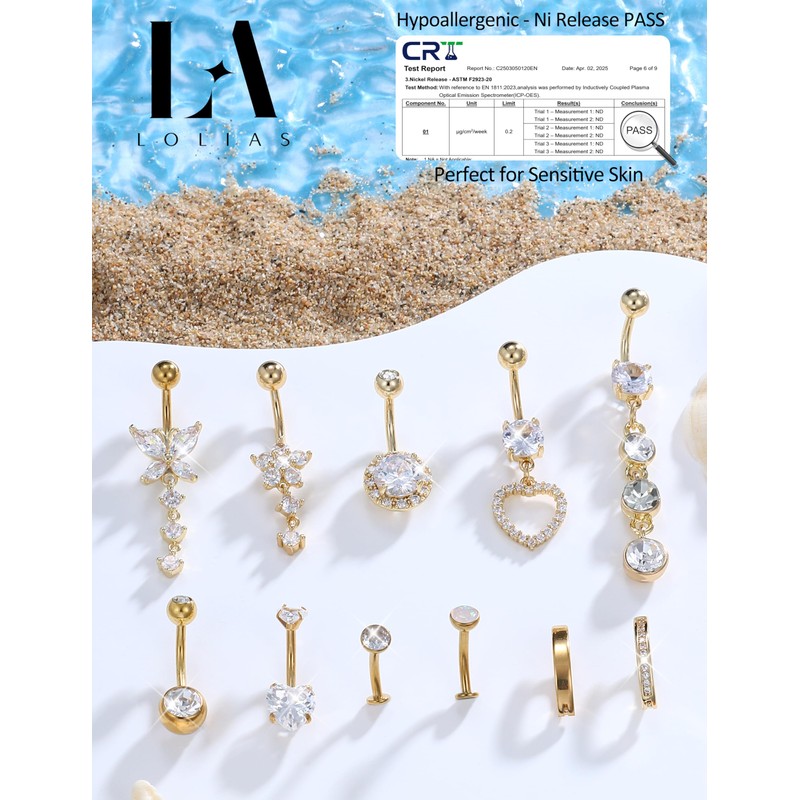 The LOLIAS Belly Button Ring Set presents 11 on trend styles including 2 reverse curved belly rings with 1 opal inlaid and 1 white CZ set 2 hoop belly button rings 3 short belly piercings with heart and round CZ designs and 4 dangle belly button rings featuring butterfly flower heart and long chain motifs. Adorned in gold tone and sparkling white cubic zirconia this set provides a rich array of styles to revamp your body jewelry collection.