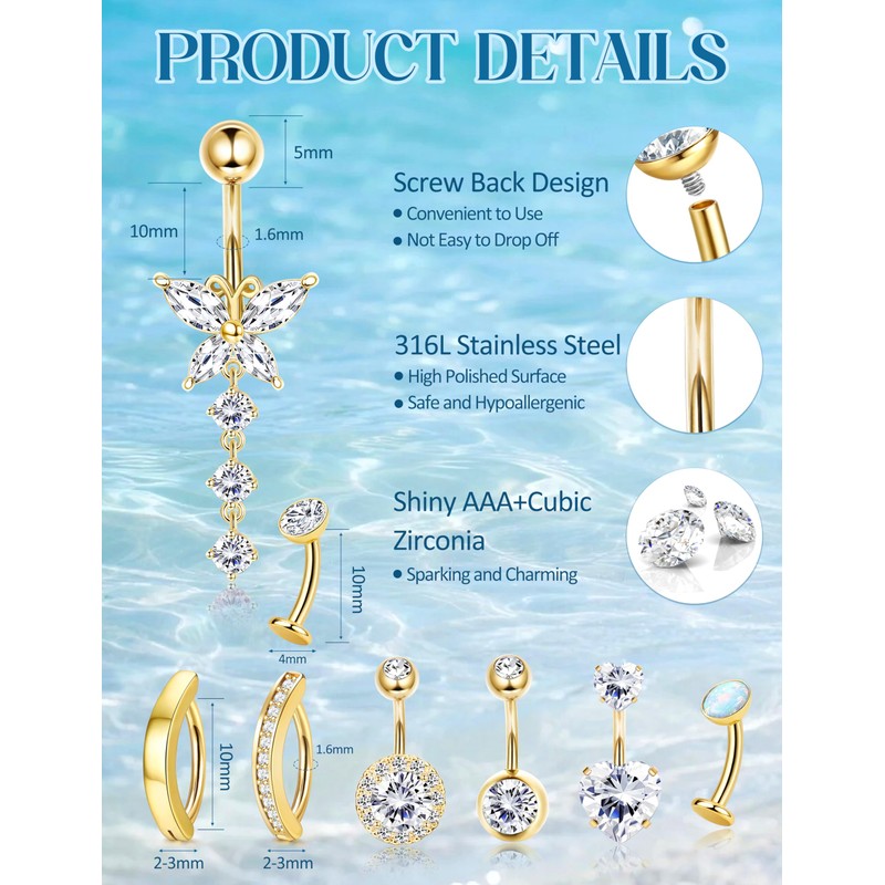 • 【Belly Button Ring Set】 Includes 11pcs trendy gold belly button rings: 2pcs clicker reverse curved belly rings in gold, 2pcs floating belly button rings in gold, 3pcs short belly piercing designs with heart CZ, and 4pcs gold dangle belly button rings like butterfly, flower, heart, and long chain. Boasting a gold belly ring and sparkling cubic zirconia, this set offers diverse styles to upgrade your body jewelry collection