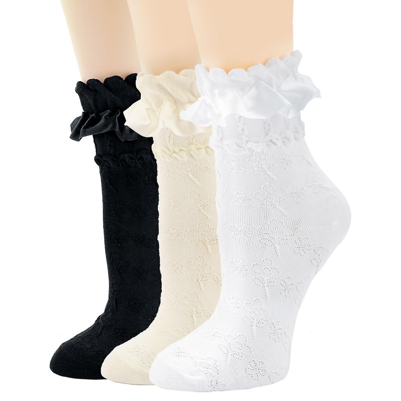 - 【Stylish and Adorable Design】:These women's lace ruffle ankle socks combine style and comfort. The charming satin ribbon lace trim and floral knit details add a playful, cute touch to any outfit, perfect for those seeking fashionable socks.