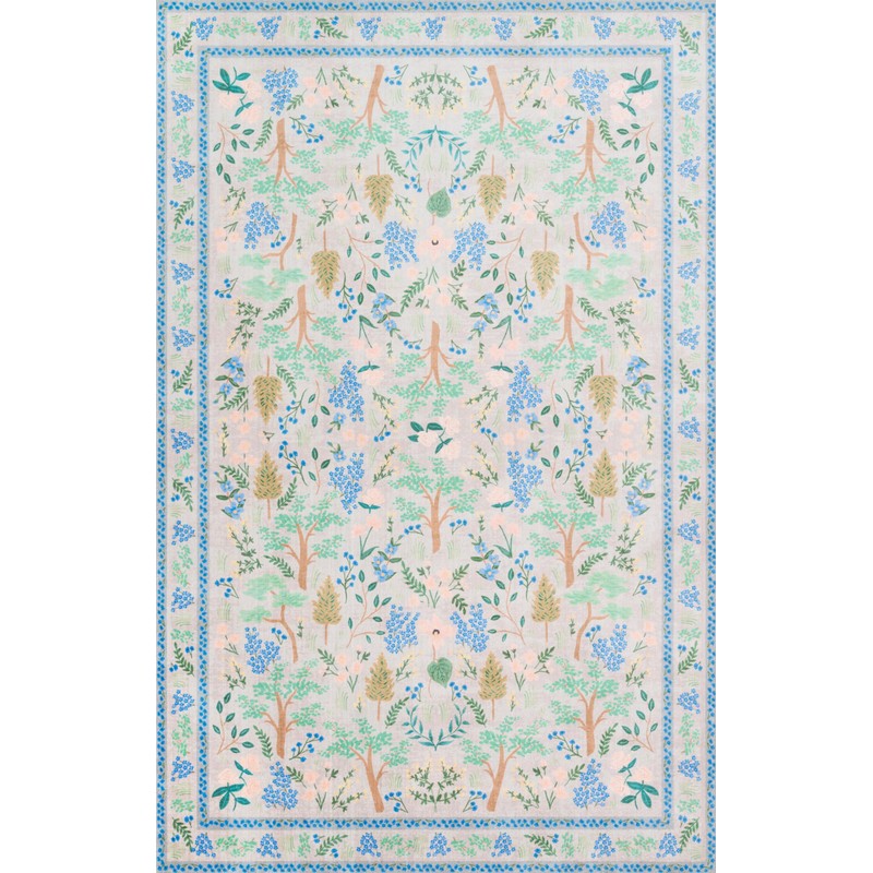 - The Jardin Collection by Rifle Paper Co. x Loloi area rug features a printed floral pattern with a smooth, easy-to-clean low pile