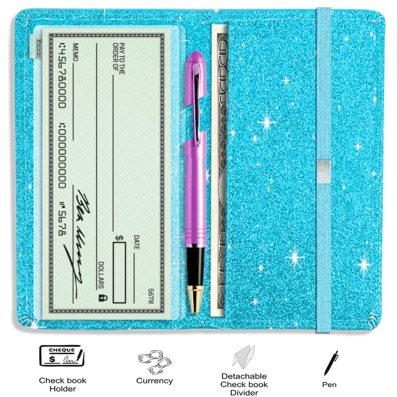 - HIGH QUALITY MATERIALS: The checkbook cover is made of premium glitter PU leather. You can feel its softness and don't care about its durability. The checkbook is precision stitched with color -matched thread. You will feel its beauty and sophistication when you receive it.