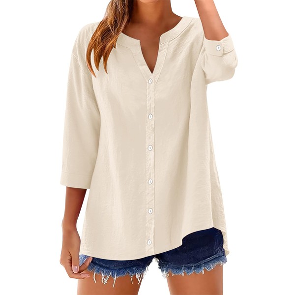 LOMON Womens 3/4 Sleeve Cotton Shirts Roll Up Short Sleeve Button Down V Neck Casual Loose Guaze Tunic Tops Apricot XL