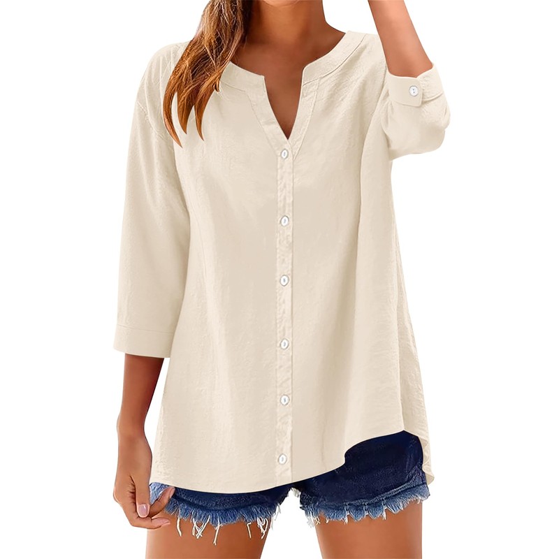 - Design: 3/4 Sleeve cotton button down shirts for women features v neck, 3/4 length sleeves, rolled up short sleeve, button up shirt, classic solid colors and nice hem length. Cotton gauze tops for women is comfy and loose fit, at the same time, design is simple and stylish.