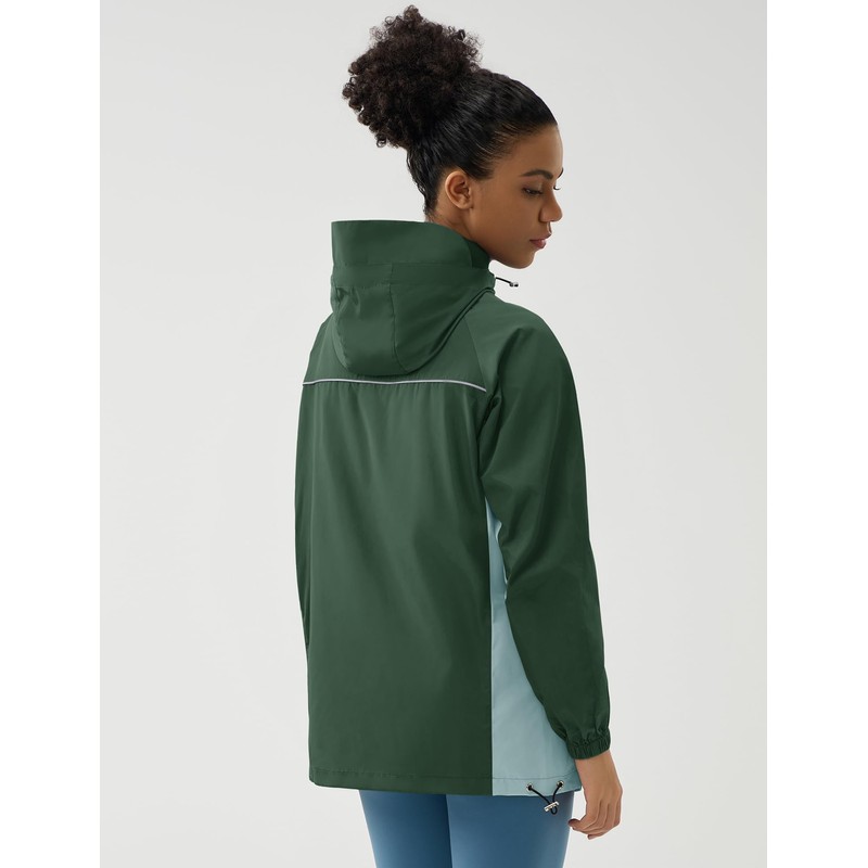- Design: Women's Rain Jacket with attached hood, Drawstring at hood and hem. Waterproof side pockets and chest pockets.Contrast color and solid color options. Reflective dividing lines create a cool look that is both fashionable and functional.