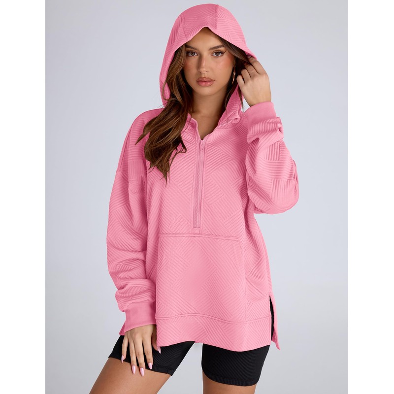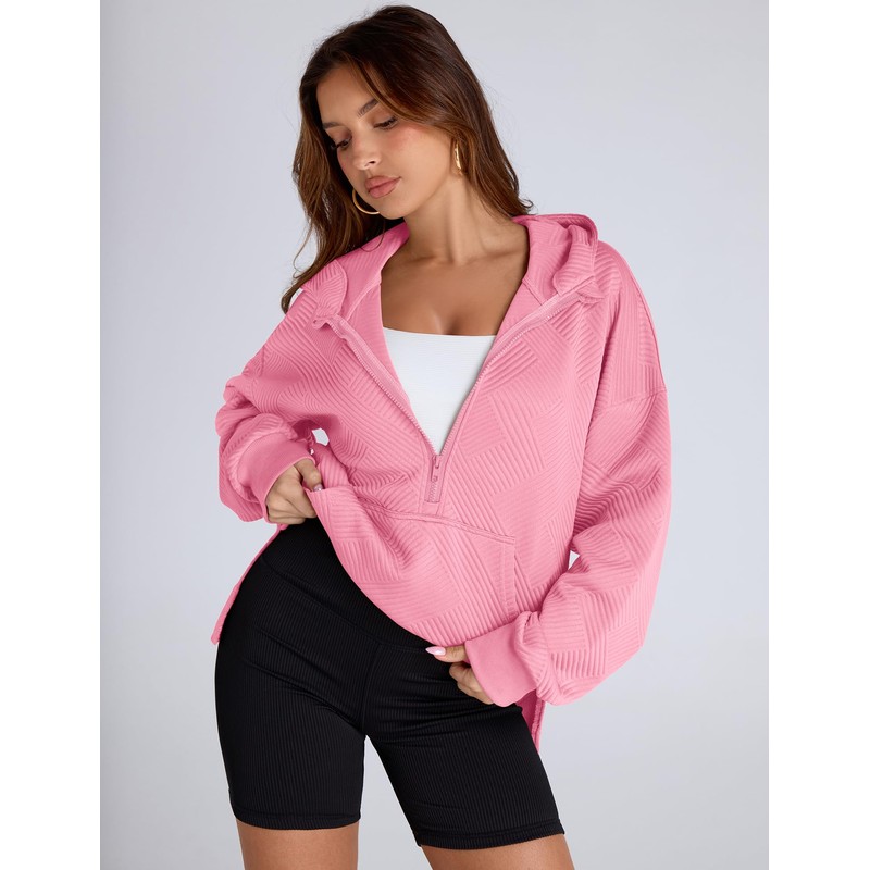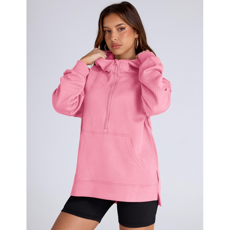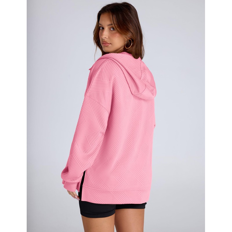 LOMON Womens Oversized Half Zip Hoodies Long Sleeve Textured Casual Sweatshirts Loose Fall Pullover Tops with Pockets Pink Medium