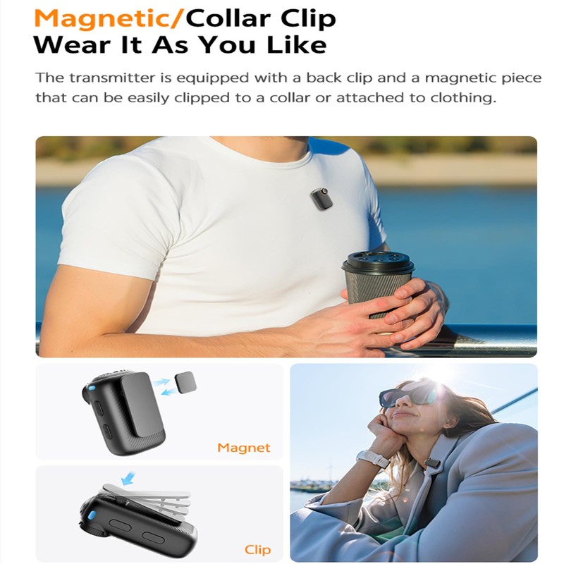 - Discreet Wearing Design: The mini microphone transmitter comes with a clip and magnetic plate for easy attachment to collars or other surfaces, ensuring flexible and convenient use in any environment. Paired with Lightning and USB-C adapters, it's compatible with multiple platforms including iPhone, Android phones, tablets, cameras, and more. Ready to use out of the box – simply connect and start recording
