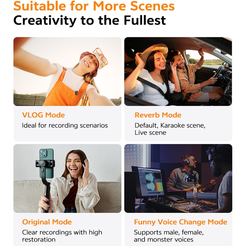 - Bluetooth Accompaniment & Two-Way Monitoring: This wireless microphones includes a dedicated Bluetooth accompaniment chip for high-definition backing music, featuring reverb, original voice, and voice changer modes. Both the receiver and transmitter support two-way monitoring technology with stable, low latency. It's ideal for various creative scenarios like stage performances, short videos with plots, interviews with background music, and more