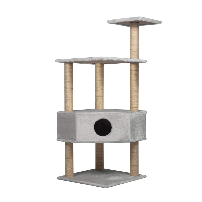 LONABR Cat Tree Condo is made from highly durable compressed wood and good quality plush material.Multiple scratching posts are covered by natural sisal ropes which is perfect for your cats to scratch, climb, play and become active,they can take a nap in the condo, jump up and down.Solid construction with balanced design and strong base offer lots of lounging room and fun to your kitties,match well with your room's furniture. Specifications: \- Color: Grey \- Material: Particle board + plush fabric covering \- Some simple assembly required Package Contents: \- 1 x Cat Tree \- 1 x Instruction