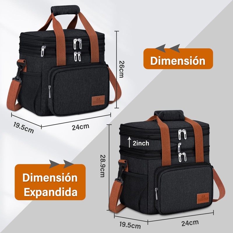 - LIGERO Y PORTÁTIL:El tamaño total de la bolsa para almuerzo es: 26*24*19.5 cm, el peso es de 0.55 kg, es muy ligero, plegable y no ocupa espacio. La parte superior de la bolsa de almuerzo cuenta con una cremallera bidireccional para garantizar una fácil apertura y cierre.La bolsa almuerzo se puede llevar en una variedad de formas, como en la mano, al hombro y en bandolera, por lo que es muy conveniente para su uso.
