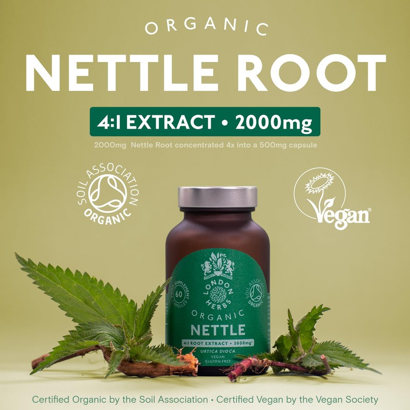 London Herbs Organic Stinging Nettle Root Extract 2000mg | High Strength 4:1 Extract Stinging Nettle Supplement | 60 Vegan Capsules | Made in The UK | Sustainably Packaged & Produced