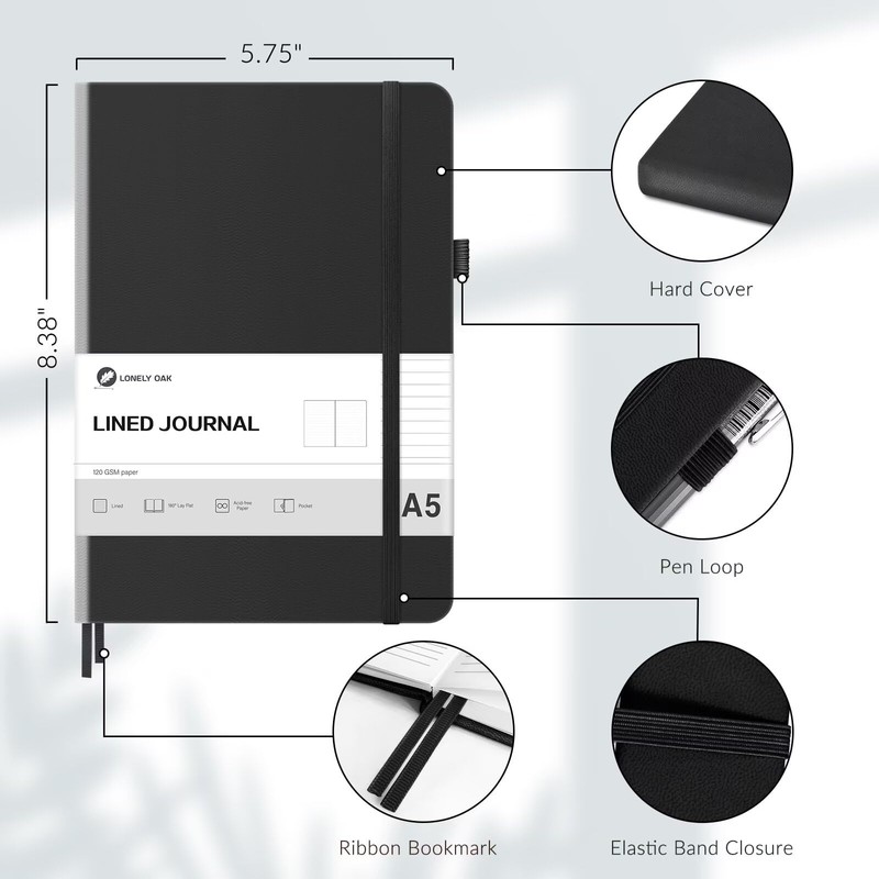 Lonely Oak Lined Journal Notebook, A5 Hardcover Lined Notebook for Women & Men, 120GSM Acid-Free Paper with Leather Hardcover and Inner Pocket, Daily Diary Journal for Work (Black)