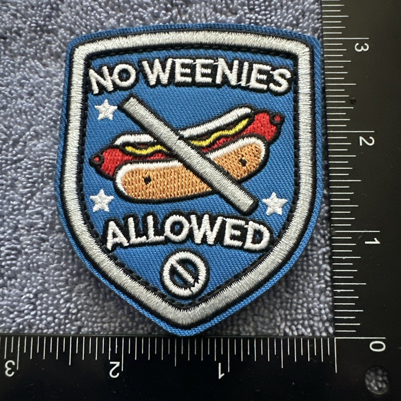 NO WEENIES ALLOWED American Hook & Loop Morale Patch. Condition NEW! Free Shipping!! Shipped via Trackable USPS First Class Mail. Shop With Confidence, Free 30 Day Returns!