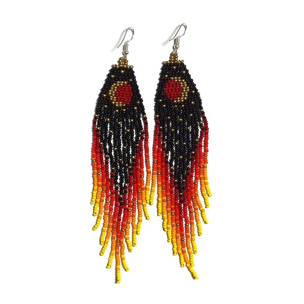 Long Beaded Dangle, Hoop Earrings – Boho Native Handmade Seed Bead Tassel Earrings, Bohemian Large Statement Beaded Drop Fringe Earrings for Women (Black & Yellow)