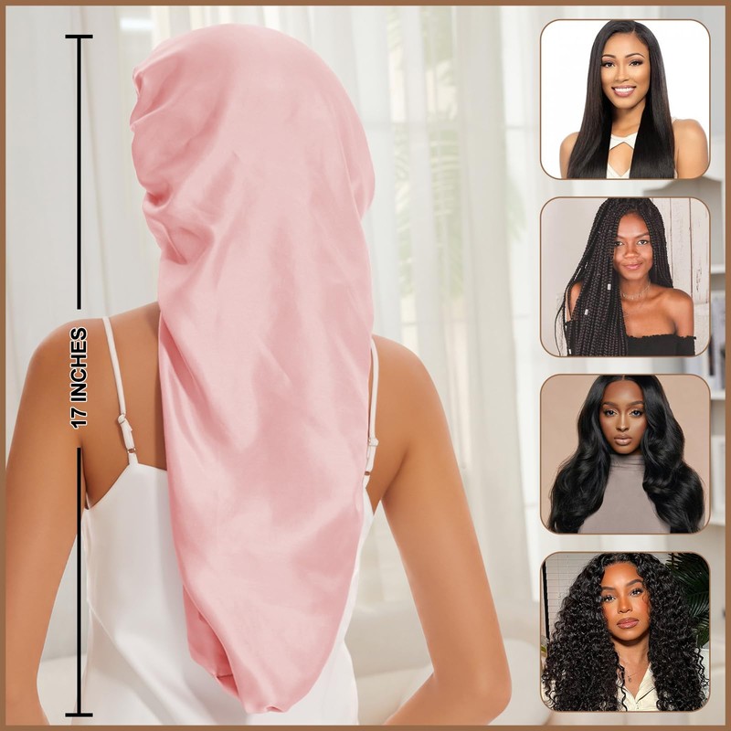 Long Bonnet for Braids & Curly Hair, Silk Satin Bonnet for Sleeping, Extra Large Bonnets for Women Braid Shower Cap (Black Light Pink)